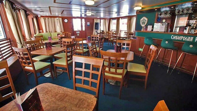 Если пройти по средней палубе на нос теплохода – окажетесь в уютной кофейне, интерьер которой напоминает о закате над гладью реки.